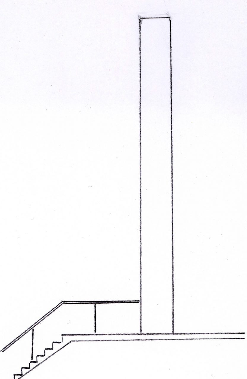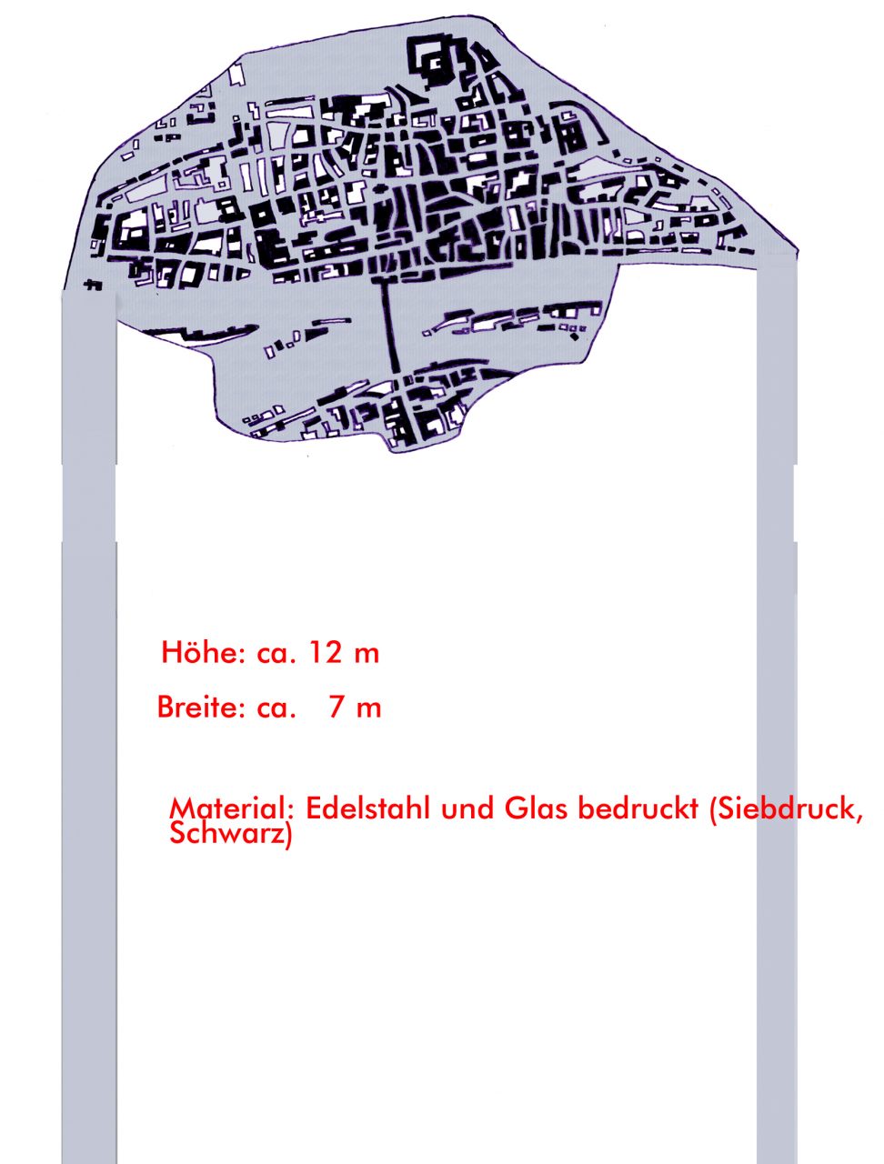 Edelstahlsäule (530x20x20 cm) mit 4 bedruckten Glasplatten (je 175×70 cm),